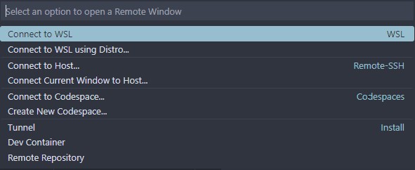 This runs on my Windows host. But VS Code allows me to connect to it as a remote window. When connected this way, everything I do in VS Code will execute in the WSL environment3.